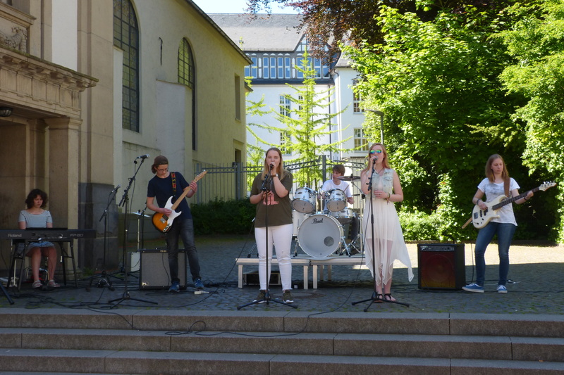 Jeden Donnerstag findet zudem die Rock-AG mit derzeit 7 Schülerinnen und Schülern statt. Geprobt wird auf der Bühne der Altstadtschmiede unter realen Bühnenbedingungen.